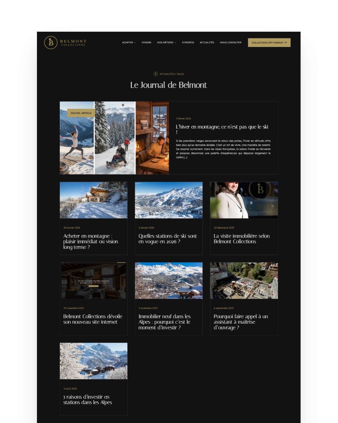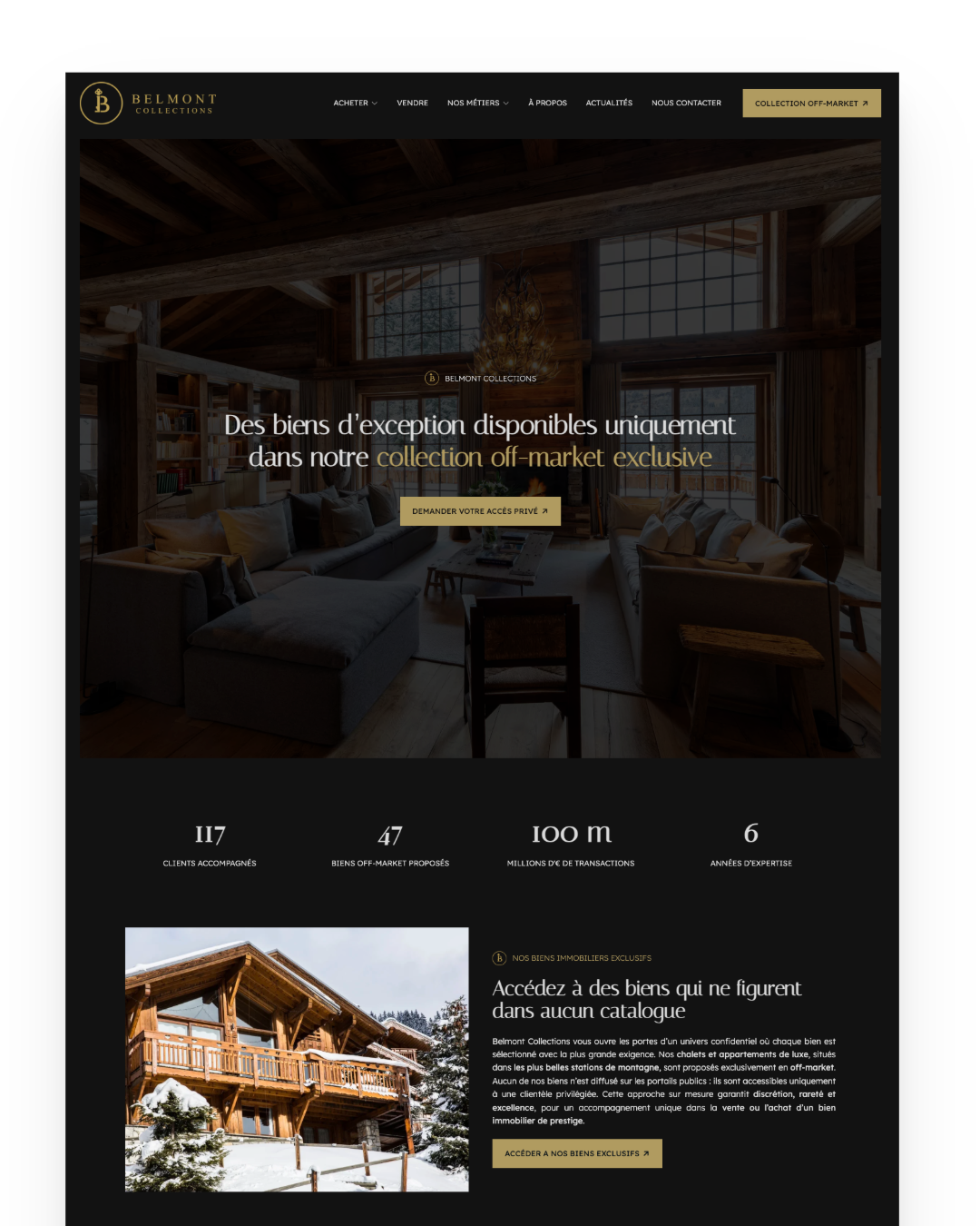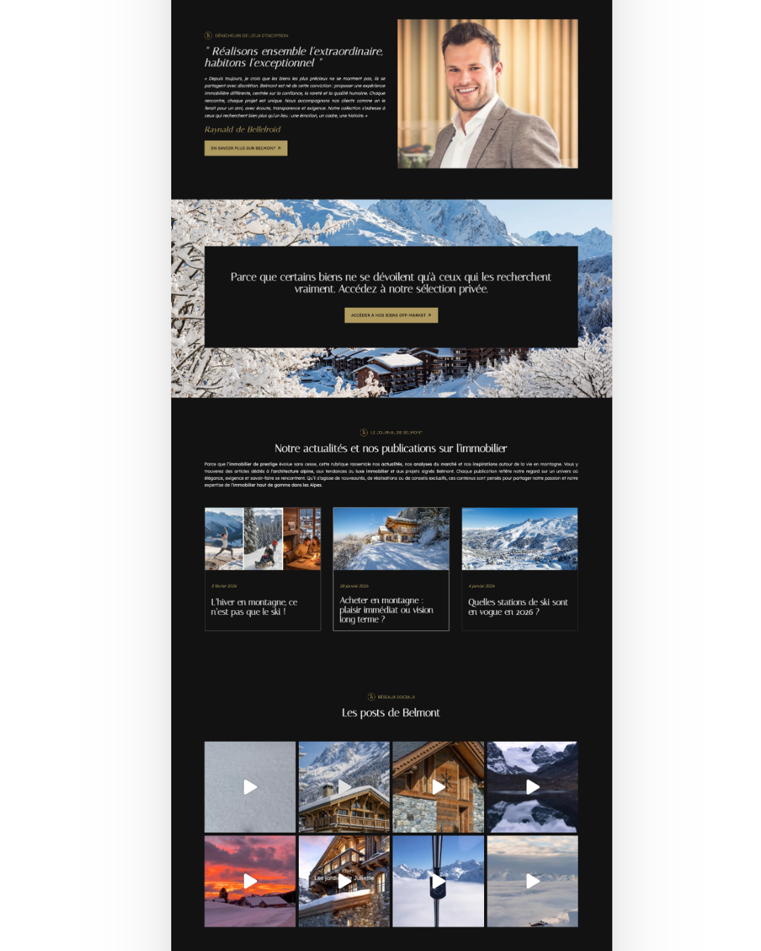 Belmont Collections souhaitait un site capable de refléter son positionnement unique dans l’immobilier de prestige. L’ancien site ne correspondait plus à l’image haut de gamme de la marque et ne permettait pas de valoriser l’exclusivité des biens proposés en off market. Le trafic organique était quasiment inexistant, les utilisateurs arrivaient uniquement via les réseaux sociaux et la visibilité sur Google était très faible pour Méribel, Courchevel et les autres stations alpines. L’agence avait également besoin de suivre précisément les KPI pour piloter son activité. Enfin, les équipes désiraient pouvoir gérer elles mêmes l’ajout des biens exclusifs dans un espace privé et maîtriser entièrement la mise à jour du site.