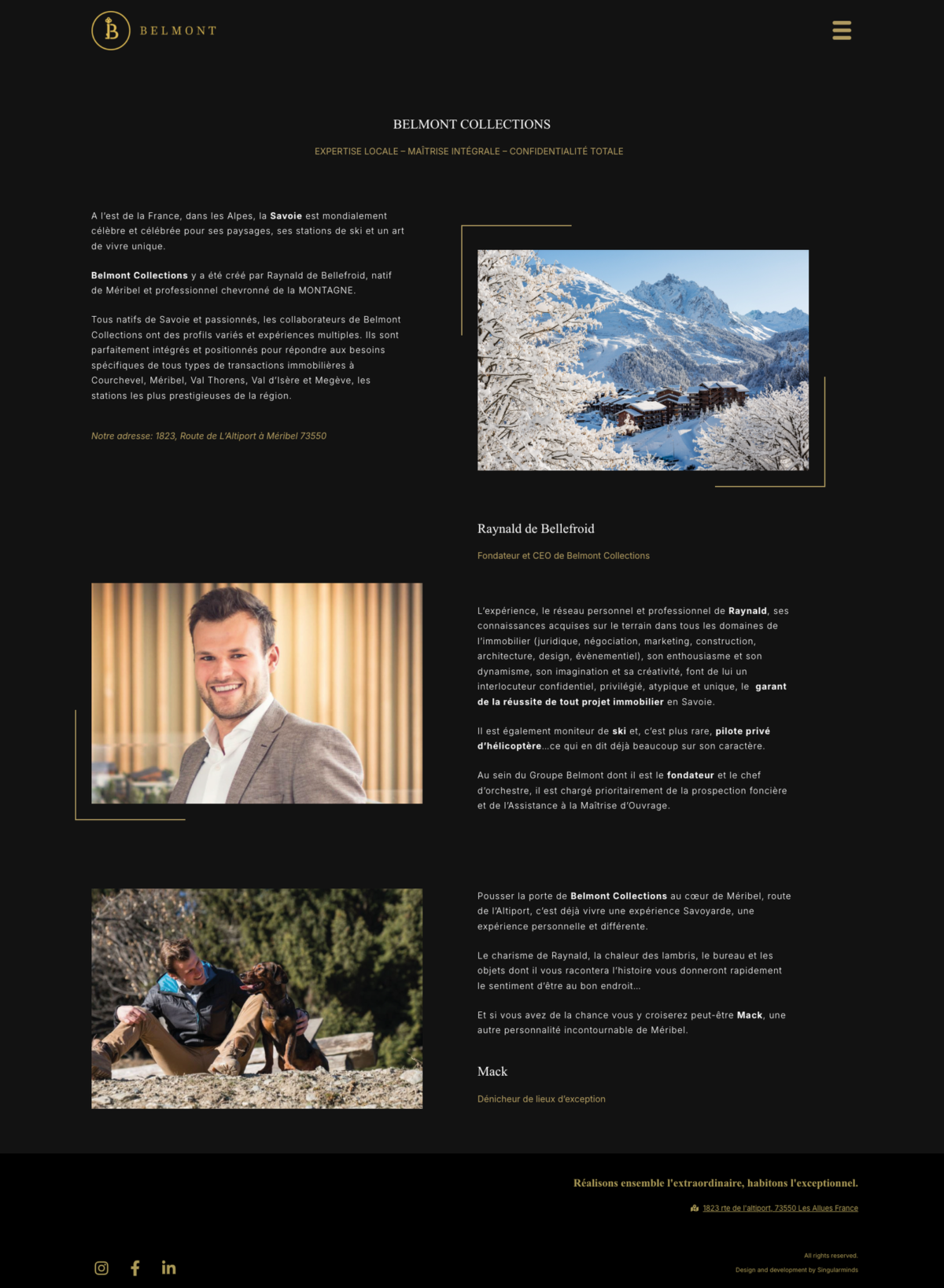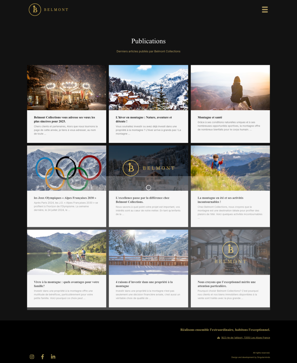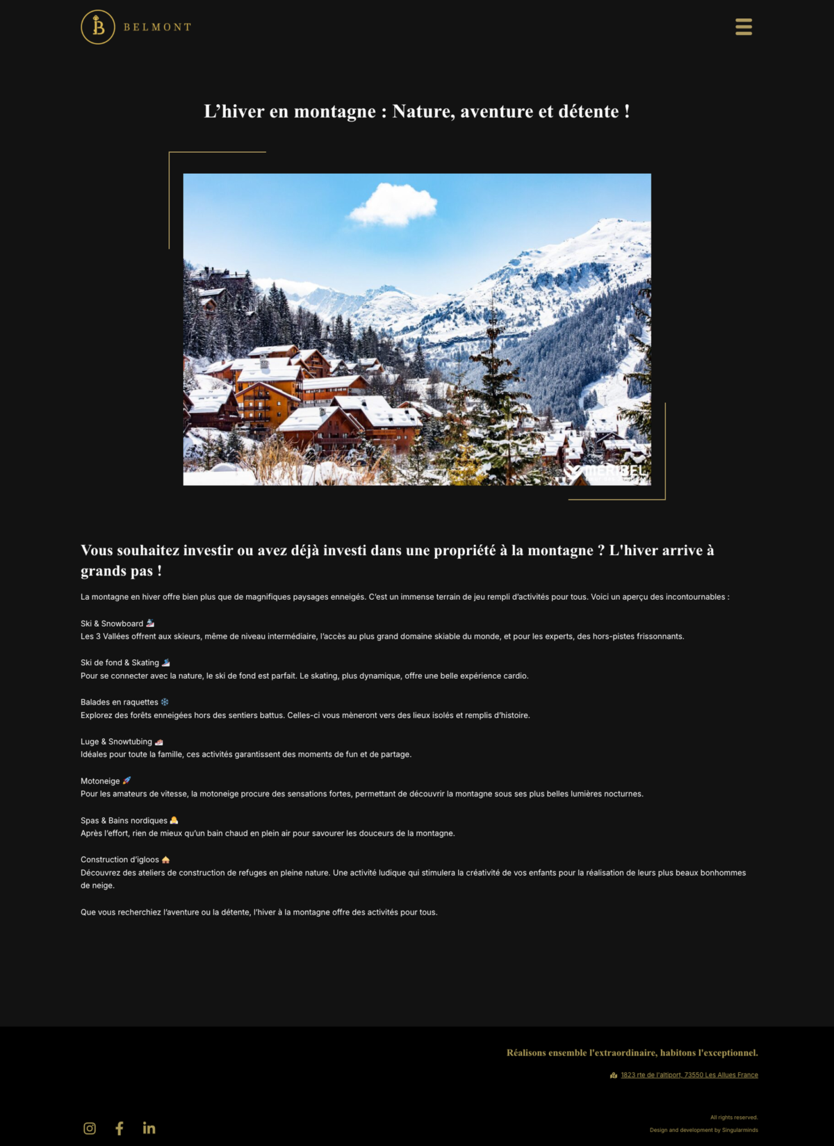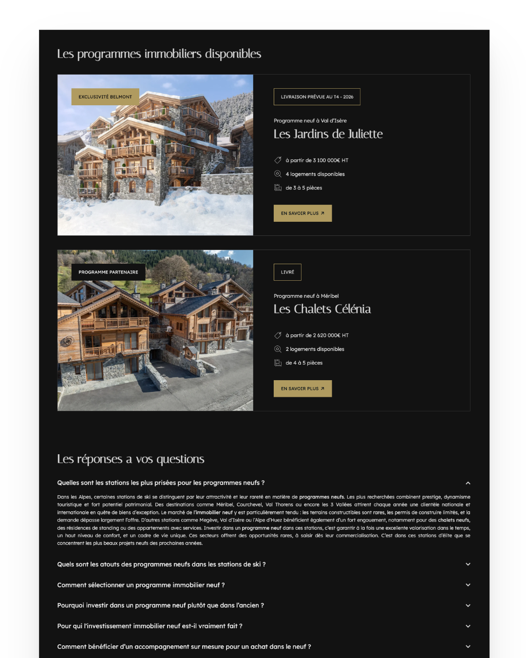 Belmont Collections souhaitait un site capable de refléter son positionnement unique dans l’immobilier de prestige. L’ancien site ne correspondait plus à l’image haut de gamme de la marque et ne permettait pas de valoriser l’exclusivité des biens proposés en off market. Le trafic organique était quasiment inexistant, les utilisateurs arrivaient uniquement via les réseaux sociaux et la visibilité sur Google était très faible pour Méribel, Courchevel et les autres stations alpines. L’agence avait également besoin de suivre précisément les KPI pour piloter son activité. Enfin, les équipes désiraient pouvoir gérer elles mêmes l’ajout des biens exclusifs dans un espace privé et maîtriser entièrement la mise à jour du site.