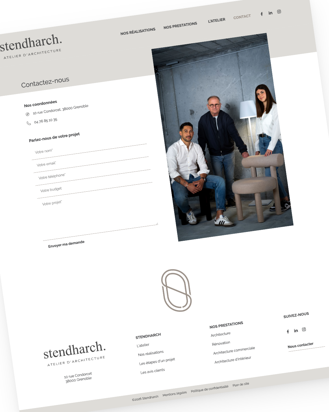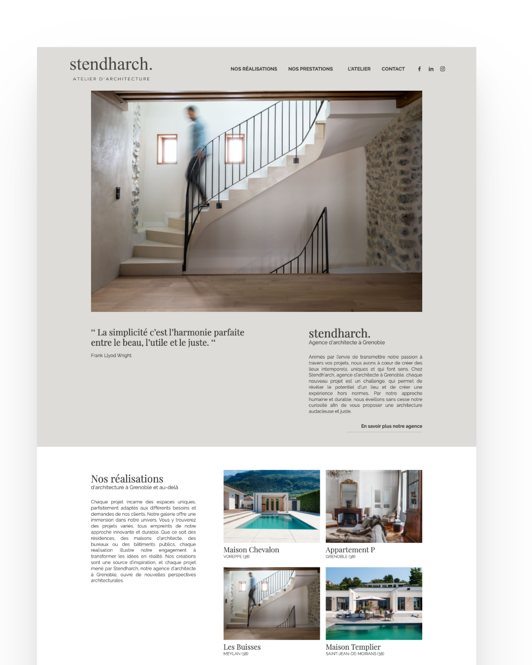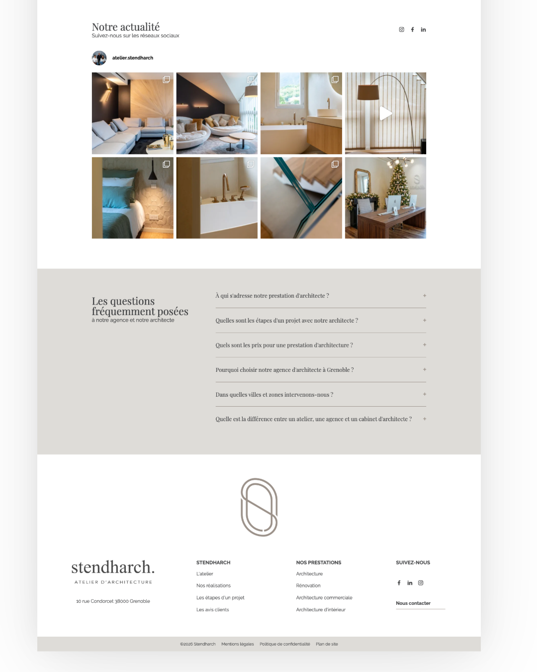 Nous avons conçu un nouveau site WordPress moderne et parfaitement aligné avec l’image de marque de Stendh’arch. L’expérience utilisateur a été repensée pour mettre en valeur les réalisations et la philosophie de l’agence. Le site a été conçu pour être simple à administrer et pour accompagner la croissance de l’entreprise. Nous avons ensuite optimisé l’ensemble de la structure SEO afin de cibler les requêtes locales liées aux architectes à Grenoble, incluant un travail approfondi sur les contenus, les balises et l’architecture du site.